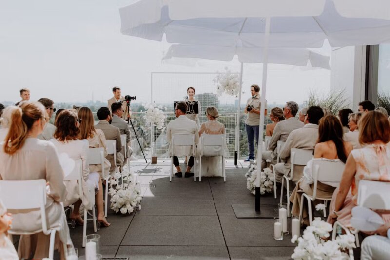 Rooftop-Locations oder Terrassen bieten euch den perfekten Ausblick auf die funkelnden Lichter der Stadt – besonders bei Sonnenuntergang ein echter Wow-Effekt. Diese Locations passen perfekt zu modernen, eleganten Hochzeiten.