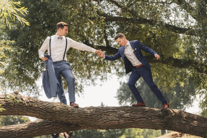 Beispiel: „Ich erinnere mich noch gut, wie [Name des Bräutigams] immer derjenige war, der als Erstes bereit war, sich in ein neues Abenteuer zu stürzen. Ob es das Klettern auf Bäume war oder das Erfinden verrückter Spiele – er hatte immer einen Plan. Meistens einen Plan, der schiefging, aber wir hatten trotzdem jede Menge Spaß.“