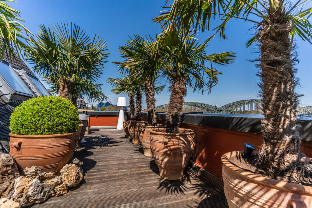 Ihr erhaltet Zugang zu über 1.000 Quadratmeter Fläche mit atemberaubendem mediterranen Rooftop-Garden und 360° Blick auf Köln!